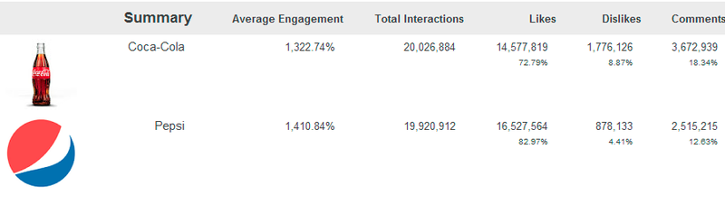 A Pepsi, por exemplo, obteve um maior número de curtidas, enquanto a Coca-Cola recebeu mais comentários e descurtidas. Por isso, então, que o engajamento da Coca-Cola foi maior.