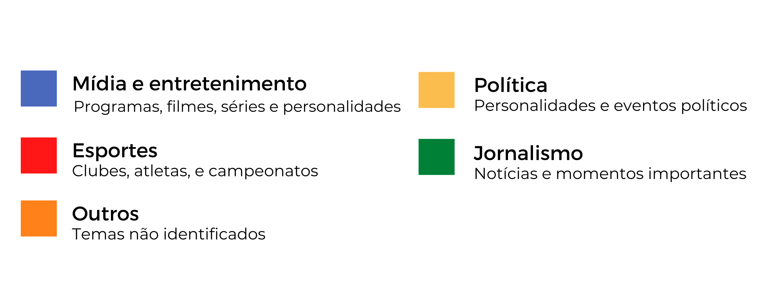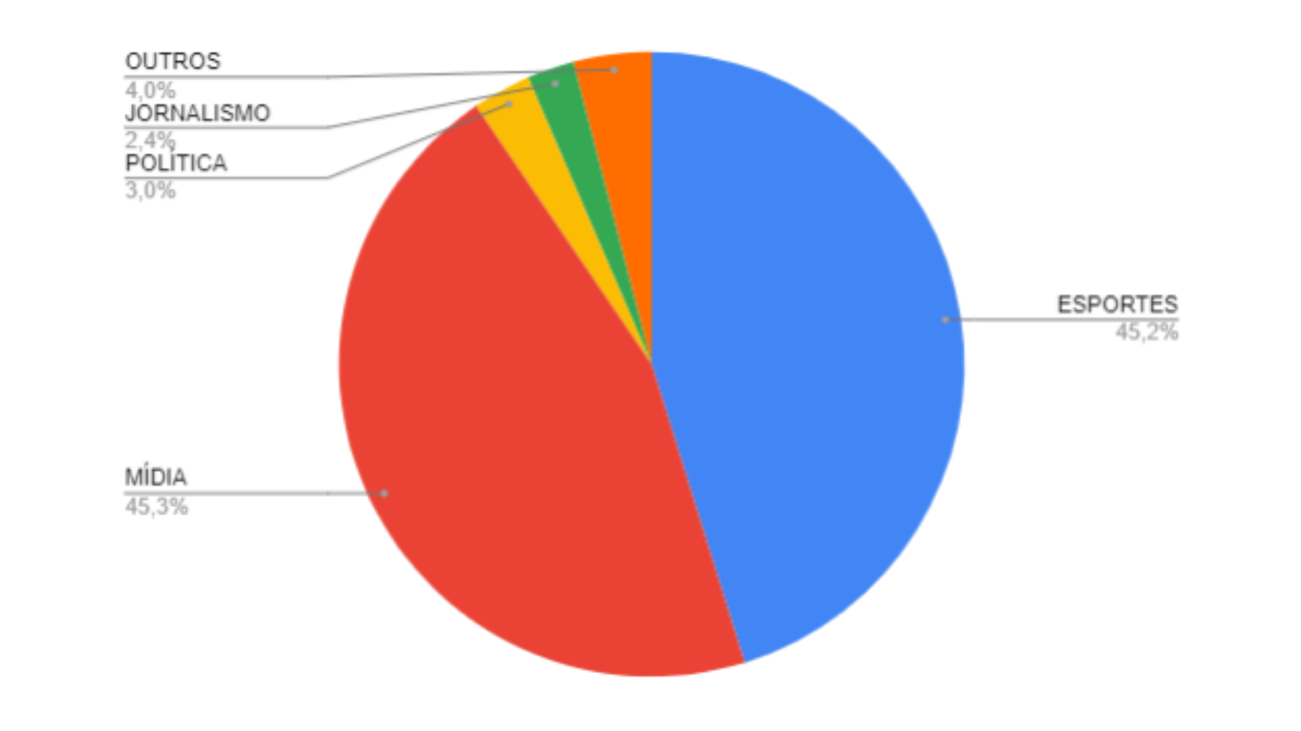 No resumo do ano de 2021, classificamos os top 10 Trending Topics de cada mês em categorias e tivemos a seguinte distribuição: Com 45.3% o tema mídia e entretenimento foi o mais presente nos Trending Topics 2021, seguido de esportes (45.2%), política (3%) e jornalismo (2.4%).