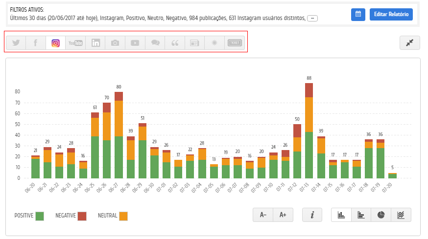 Dentro da tela de edição do relatório, clique no ícone do Instagram na barra superior e certifique-se de que ele é o único selecionado. Assim, o Buzzmonitor mostrará apenas as publicações encontradas dentro desta rede social.