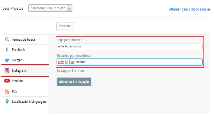 Depois, vá para a aba Instagram, na qual você definirá as tags que deseja buscar no campo Tags to search e/ou usuários que quer monitorar no campo Users to monitor.