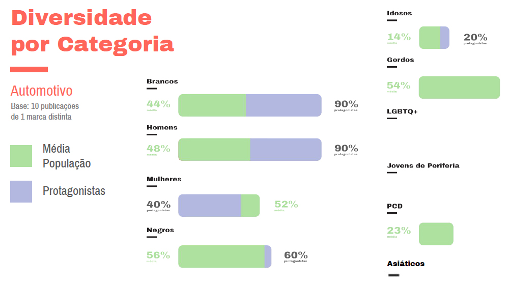 Outro ponto que se destaca na análise é a falta de representatividade de asiáticos, PCD e jovens de periferia na categoria.