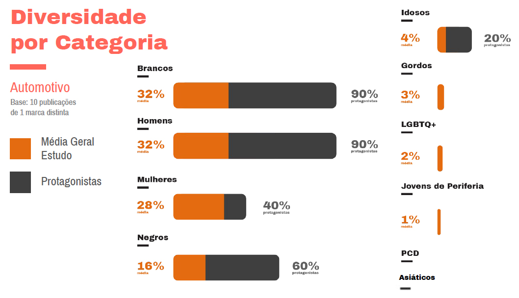 Além disso, o mesmo padrão de reforço de estereótipos acontece também no segmento automotivo, onde a presença masculina é predominante e compõe 90% das imagens analisadas.