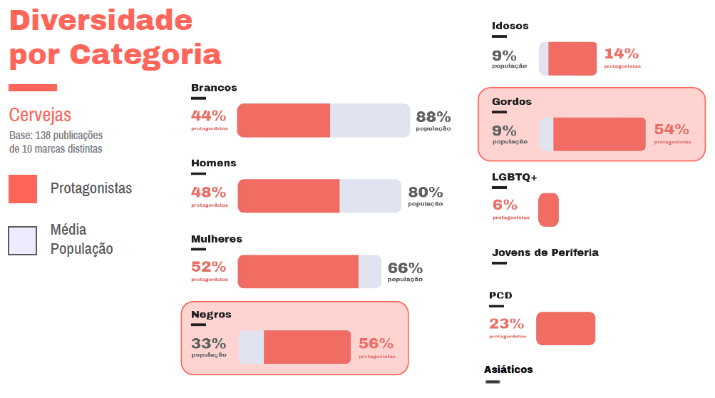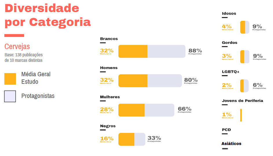 Na publicidade das marcas de cerveja são frequentes imagens e vídeos em grupos distintos, mostrando diversidade de gênero e de raça na representação. Ainda assim, os homens e brancos se fazem presente em mais de 80% das publicações.