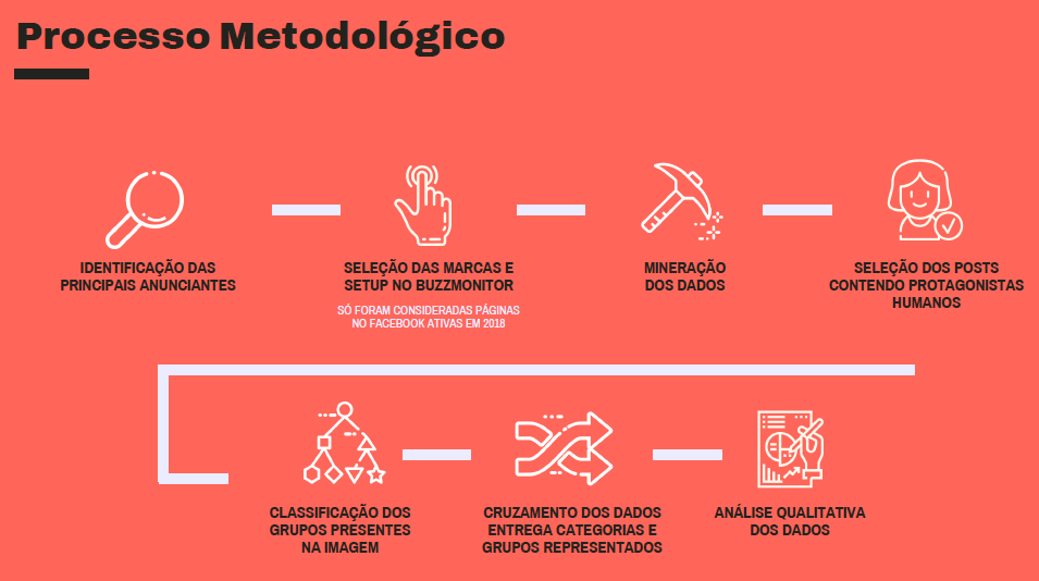 Em cada uma das publicações foi identificada a presença de grupos protagonistas e analisadas apenas as imagens das peças nos formatos foto e vídeo, sem análise de conteúdo de texto ou segmentação de mídia.