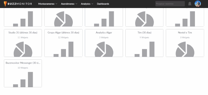 1. Clique em Dashboards e depois em Novo dashboard. Selecione os relatórios que você deseja visualizar no dashboard e clique em Salvar.