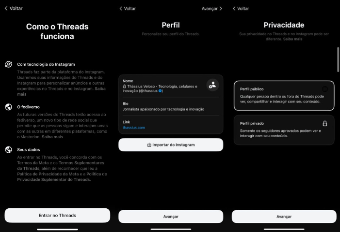 Para criar um perfil no Threads, o usuário deve apenas baixar o aplicativo e fazer login com a sua conta do Instagram, que será vinculada ao novo perfil. O login e senha dessa rede social será o mesmo do Instagram e é possível optar por um perfil público ou privado.