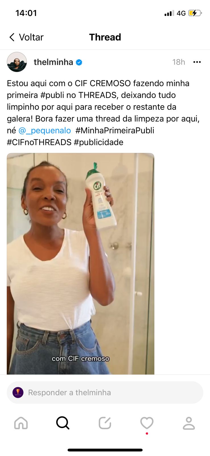 E teve marca que saiu na frente no quesito publicidade. Ainda na primeira hora de lançamento do Threads, a influenciadora Thelma Assis, médica e campeã do BBB20, postou uma publi em parceria com a Cif, marca de produtos de limpeza da Unilever.