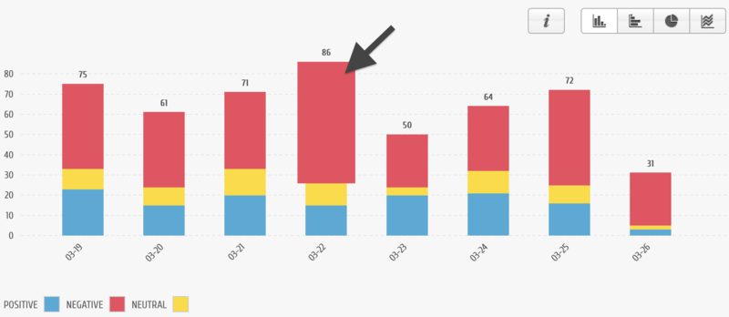Clique sobre parte de qualquer gráfico em um relatório para visualizar o conjunto de posts relativo àquele gráfico. No exemplo abaixo veja apenas as publicações negativas da última hora.