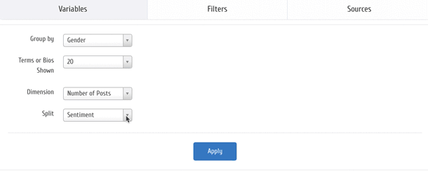 Agora não é necessário sempre separar as informações por “sentiment”, “service” e “brand”. Na aba de Variables (Variáveis) do Edit Report, “no split” (não separar) pode ser usado como modo de separação das informações do gráfico. Ou seja, não separar por nenhuma métrica.