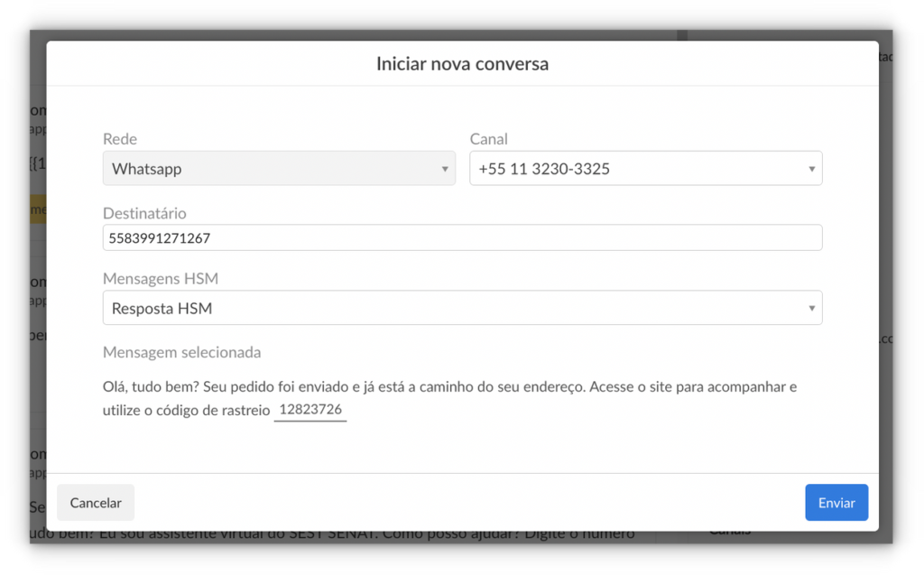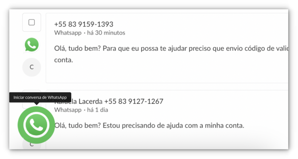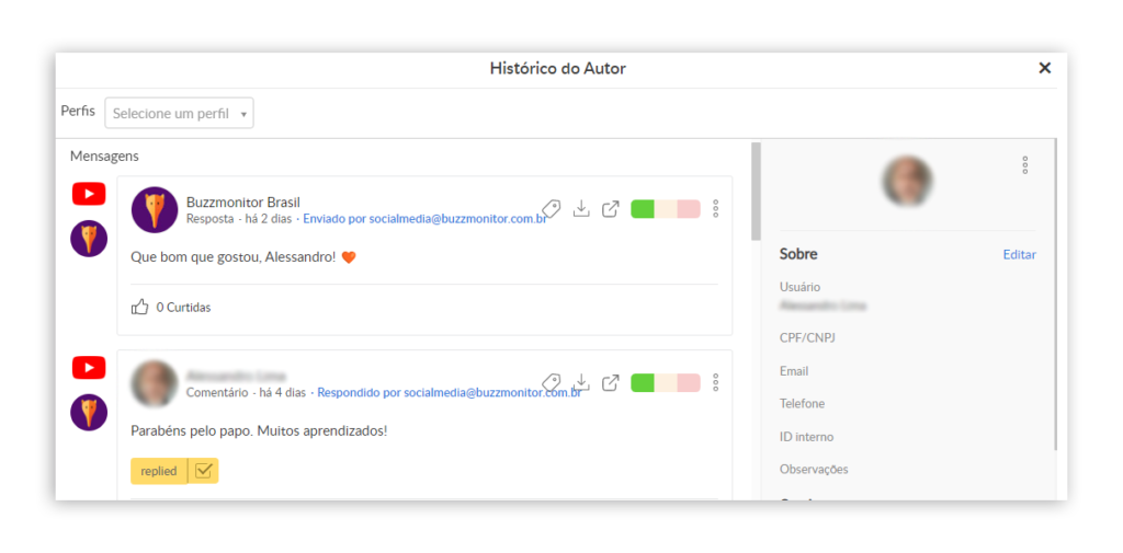 Basta selecionar o botão flutuante no relatório ou a opção “Iniciar conversa” no histórico do autor de uma interação de qualquer rede e enviar uma das mensagens estruturadas anteriormente cadastradas.