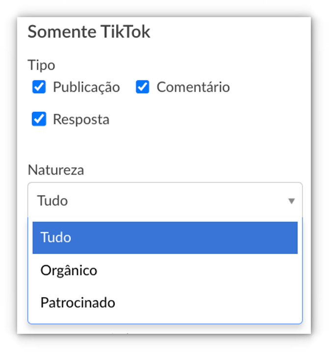 Adicionamos o filtro por natureza para publicações de TikTok, permitindo filtrar interações orgânicas e patrocinadas nos relatórios e triggers.