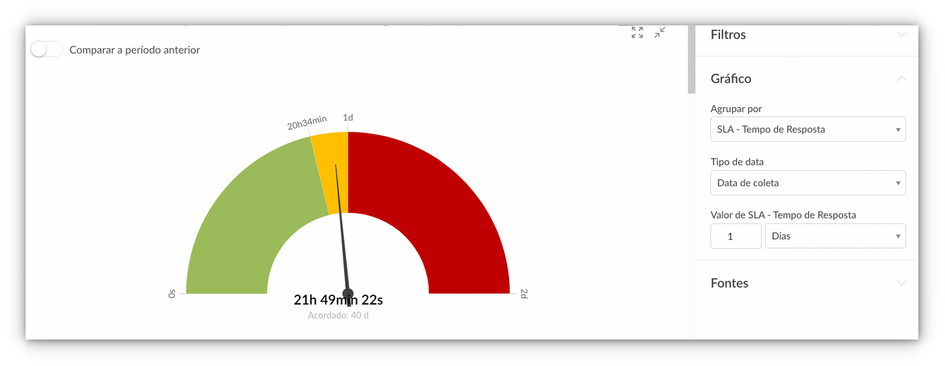 Ao selecionar a opção Data de coleta nas configurações dos gráficos agrupados por SLA – Tempo de resposta, é possível visualizar a média do período em relação ao acordado nas interações do relatório.