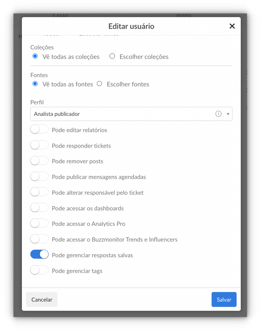 Adicionamos uma nova permissão para limitar o gerenciamento de mensagens salvas por usuários do tipo Analista Publicador.