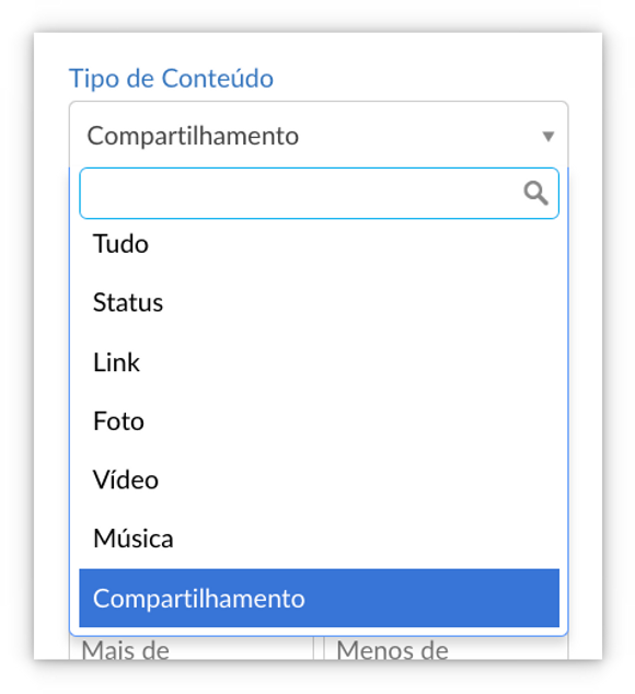 Essas interações agora também poderão ser filtradas pelo tipo Compartilhamento nos filtros de tipo de conteúdo exclusivos para Facebook nos relatórios e nos triggers.