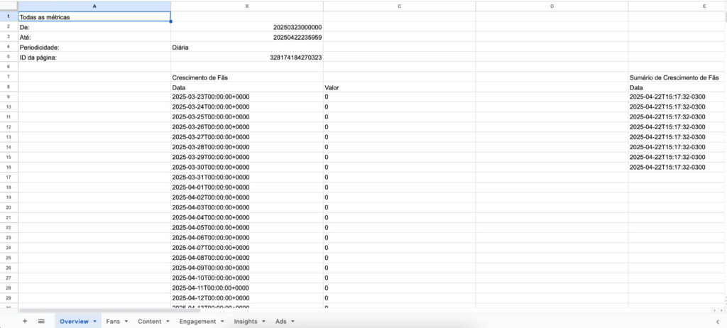 A estrutura do arquivo segue o mesmo padrão das exportações individuais, com as métricas organizadas por abas, facilitando a análise e o cruzamento de dados em um só lugar.