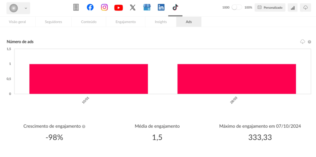 Também adicionamos a aba Ads com gráficos e métricas exclusivas para publicações patrocinadas no TikTok, proporcionando uma visão mais detalhada do desempenho dos conteúdos impulsionados.