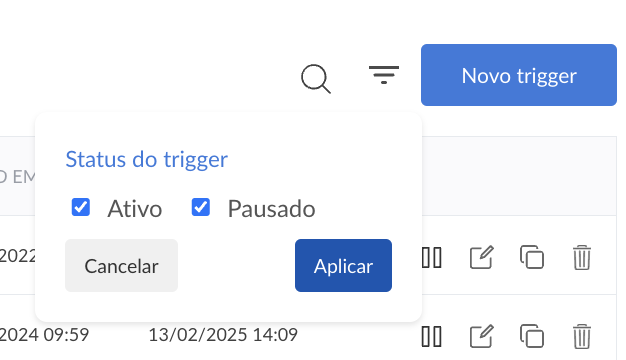 Também é possível filtrar a lista de triggers por status: ativas, pausadas ou ambas.