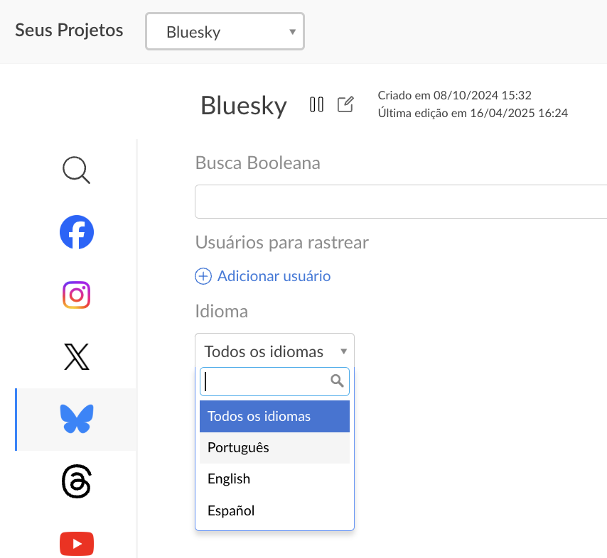 Adicionamos a opção de filtrar a coleta de interações por idioma no Bluesky, permitindo análises mais precisas e segmentadas por meio de projetos.