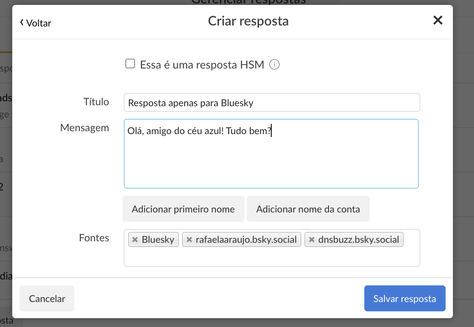 Agora é possível salvar resposta personalizadas para cada fonte de atendimento, agilizando o trabalho da equipe e garantindo mais consistência nas interações com os usuários.