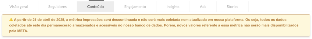 A partir de 21 de abril de 2025, a métrica de Impressões foi descontinuada pela API da Meta, deixando de ser coletada e atualizada. Todos os dados coletados até essa data permanecem armazenados e acessíveis.