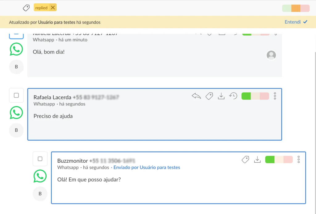 Ao clicar no alerta, as novas mensagens são carregadas e destacadas em azul, garantindo uma visualização atualizada e mais fluida para os times de atendimento.