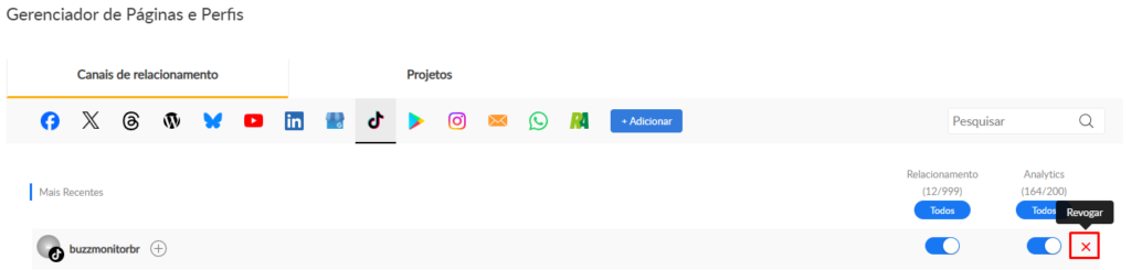 1- Acesse esse link dentro da Buzzmonitor, clique no ícone do TikTok, siga a linha do perfil que deseja reconectar e clique no X (REVOGAR) no canto direito da tela: