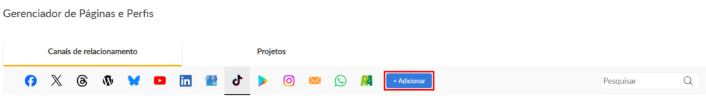 2- Ainda na mesma tela da Buzzmonitor, clique no botão +Adicionar e selecione o ícone do TikTok, para reconectar os perfis: