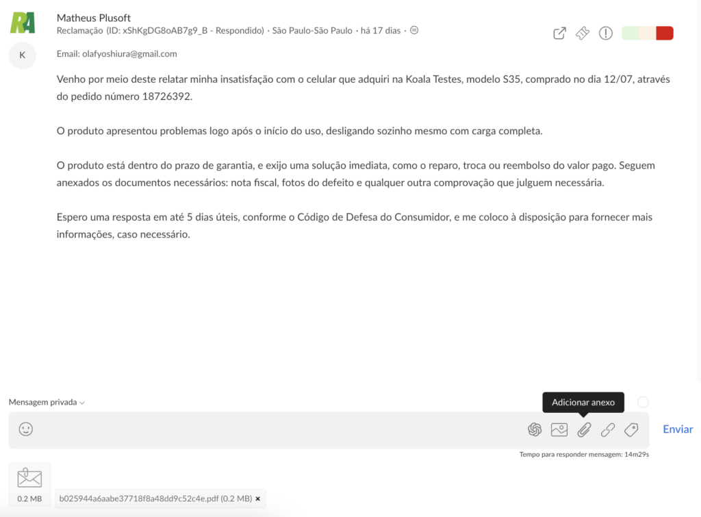 Agora, arquivos podem ser anexados ao responder interações no Reclame AQUI de forma privada, facilitando o envio de documentos e informações complementares no atendimento.