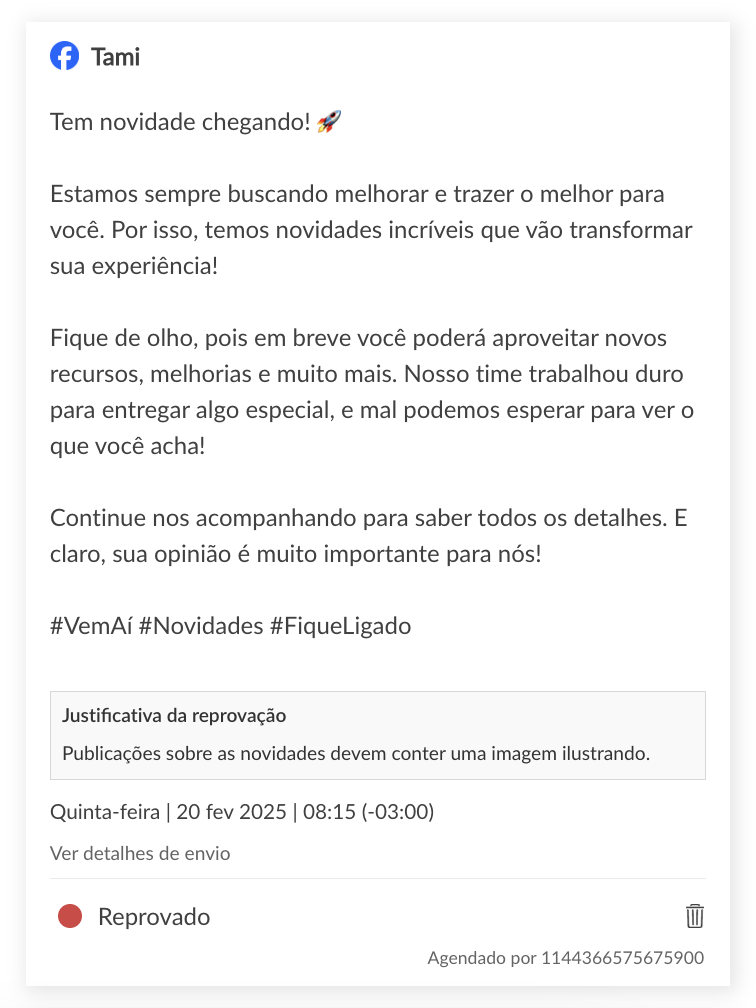 Ao reprovar um agendamento criado por um usuário secundário, agora é necessário adicionar um comentário detalhando o motivo da reprovação. O comentário adicionado é exibido no histórico com a publicação.