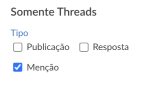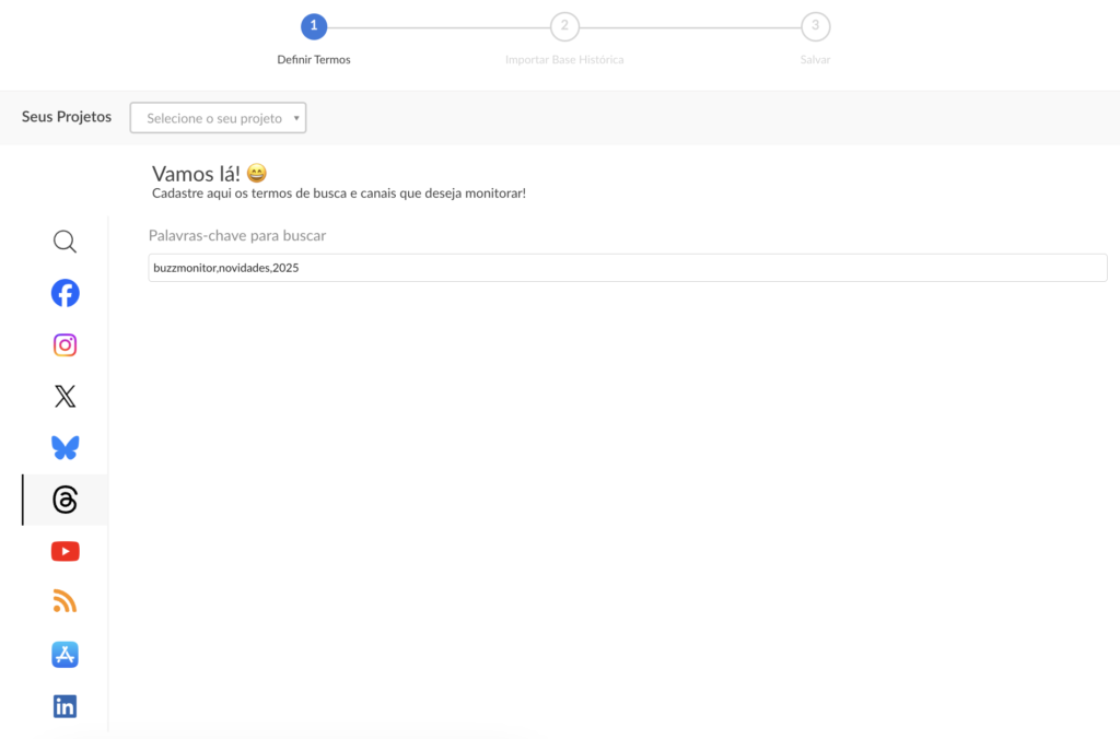Agora, publicações de outros usuários no Threads podem ser monitoradas por palavras-chave dentro dos projetos de monitoramento. Uma nova aba foi adicionada aos filtros do Threads para facilitar o cadastro dos termos.