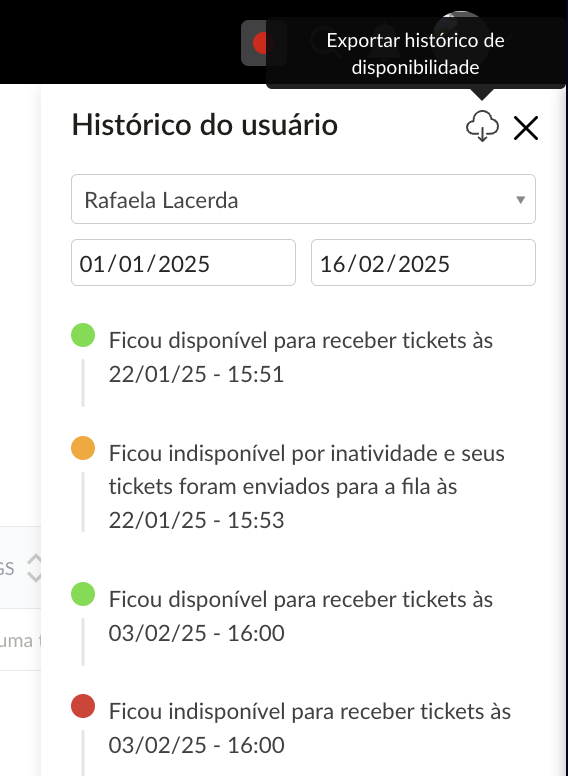Usuários que participam da distribuição automática de tickets agora podem exportar o histórico de mudanças de disponibilidade em formato XLS, filtrando pelo período desejado.