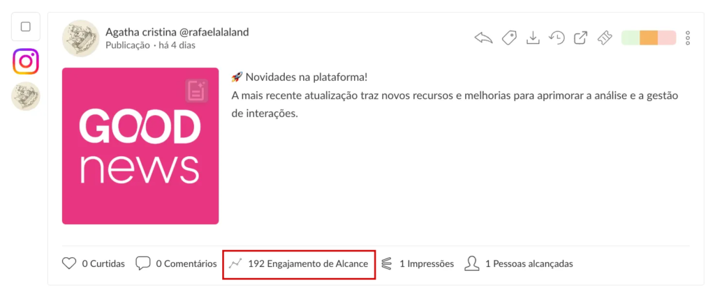 Para tornar ainda mais completa a análise de métricas das redes sociais, adicionamos a métrica de “engajamento de alcance” para Facebook e Instagram.