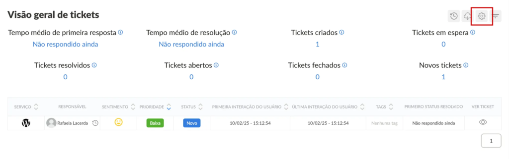 Agora, as colunas e métricas exibidas no sumário e na tabela de tickets podem ser personalizadas, assim como a quantidade de tickets exibida por página. A configuração pode ser ajustada no ícone de engrenagem no canto superior direito.