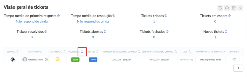Os tickets exibidos na tabela podem ser ordenados de acordo com as métricas, em ordem ascendente ou descendente. A ordenação pode ser ajustada pelas setas ao lado do título da coluna correspondente.