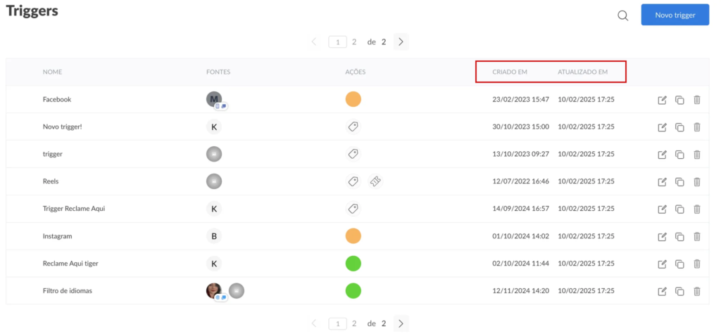 Agora, as datas de criação e última atualização são exibidas na lista de triggers, proporcionando um controle mais preciso sobre o histórico.
