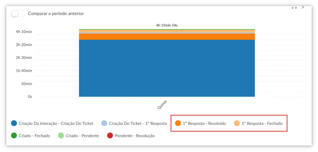 Agora são exibidos os intervalos 1ª Resposta – Resolvido e 1ª Resposta – Fechado, que contabilizam o período entre a primeira resposta ao Ticket e a alteração do status para resolvido e fechado, respectivamente.