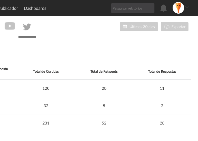 Na tabela de informações exibida na página de Visão Geral do Twitter foram adicionadas as métricas de curtidas, respostas e retweets.