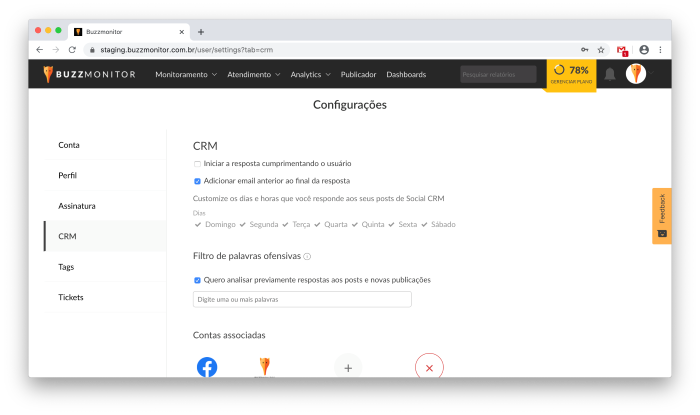 Temos uma base de palavras, mas também é possível incluir novas na aba CRM da página de Configurações.