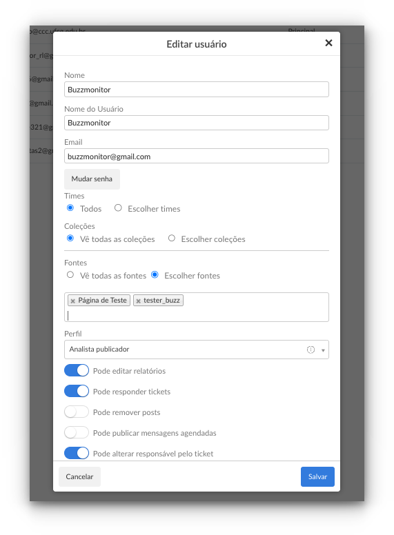 As fontes e projetos que o usuário pode visualizar são definidas durante a criação ou edição e pode ser aplicada para usuários dos tipos: