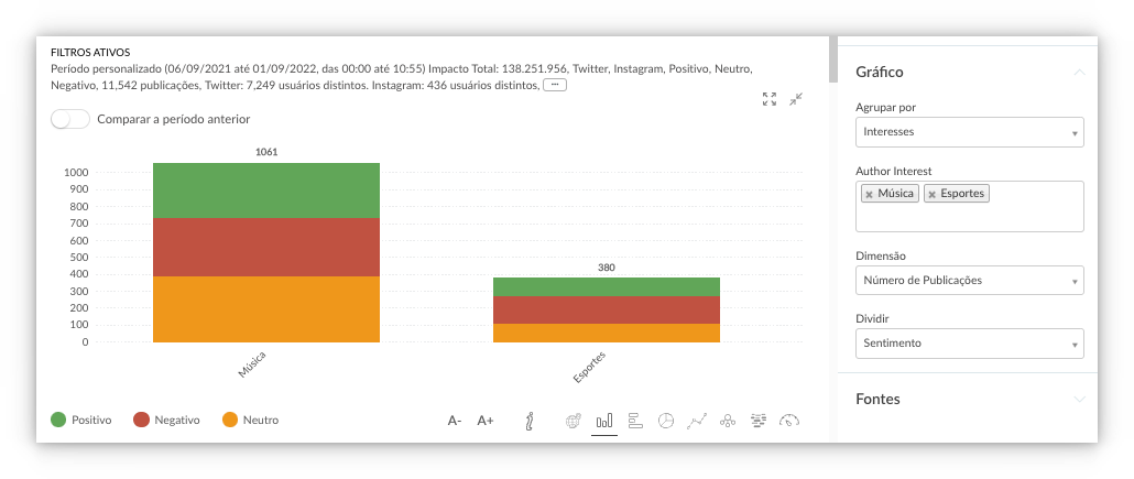 E, nas configurações dos gráficos, será possível agrupar os posts por categorias e também filtrar categorias específicas para exibição.