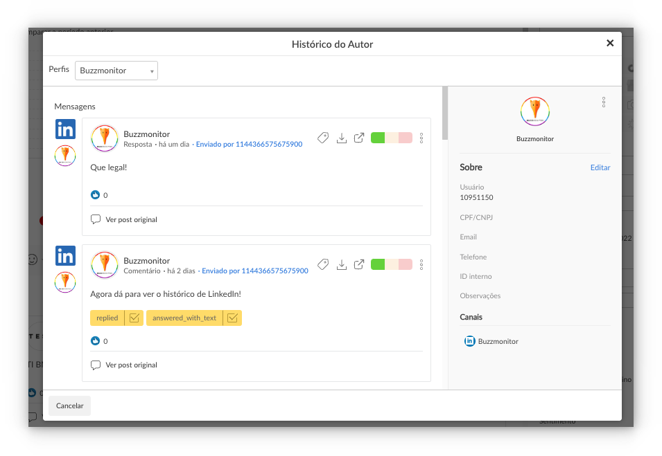 Adicionamos a visualização do histórico do autor para interações da Play Store, Youtube, Google Meu Negócio, LinkedIn e E-mail.