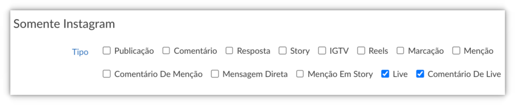 Além disso, para facilitar a filtragem dessas interações, adicionamos novos tipos no filtro de “Tipo” para interações de Instagram nos relatórios e triggers.