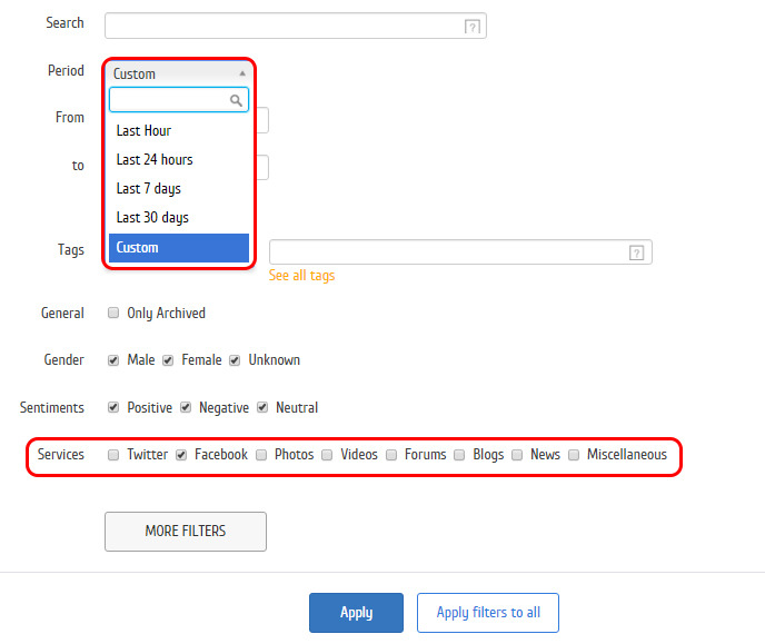 Em Filtros, defina o período de monitoramento e selecione apenas o Facebook como Serviço.