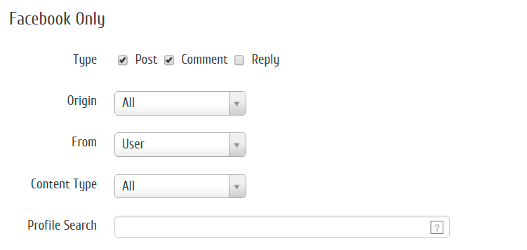 Ainda em Filtros, selecione as seguintes opções do Facebook Only: Tipo > Post e Comment, Origem > Tudo, De > Usuário, Tipo de Conteúdo > Tudo.