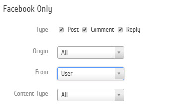 Repita todos os passos, mas altere as opções de Facebook Only para: Tipo > Tudo, Origem > Tudo, De > Usuário, Tipo de Conteúdo > Tudo.