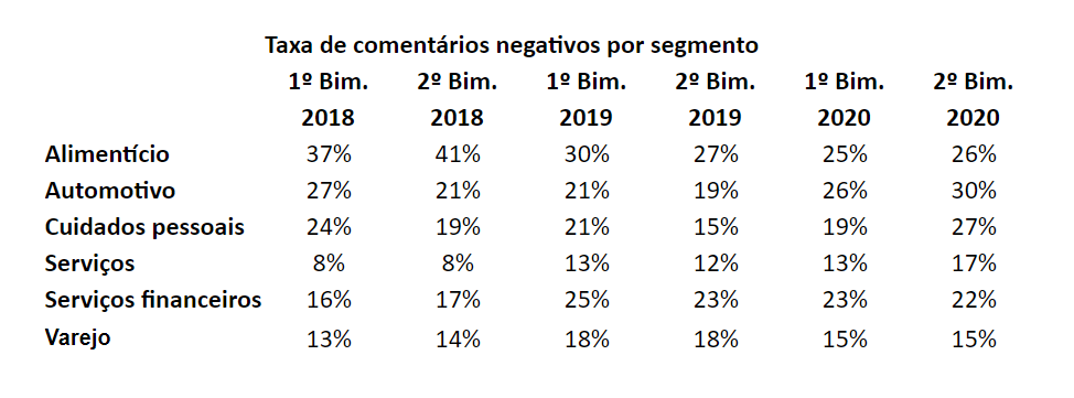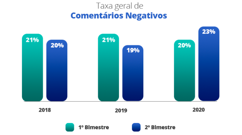 2020 ultrapassou a média histórica de comentários negativos com 3 p.p. acima da média no segundo bimestre