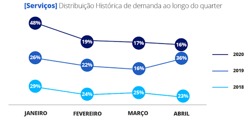 O comportamento normal de comentários negativos tende a ser mais expressivo no primeiro bimestre (janeiro e fevereiro) seguido de uma queda no segundo bimestre (março e abril), entretanto, em 2020, com o cenário da pandemia e o isolamento instaurado a partir de março, notamos que a taxa de comentårios negativos, pela primeira vez, ultrapassou a média histórica dos últimos três anos.