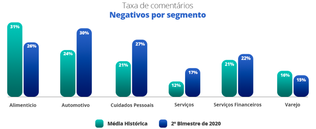 Embora as unidades físicas estejam fechadas e a maioria das marcas tenha optado pela redução ou mesmo cancelamento dos investimentos em mídia, seus canais mantiveram crescimentos contínuos de demandas de atendimento durante a pandemia. A exceção se dá nos setores automotivo e cuidados pessoais, os mesmo setores que tiveram as maiores taxas de comentários negativos.