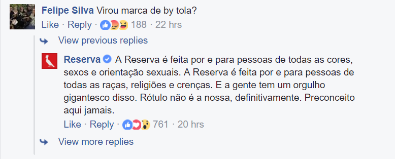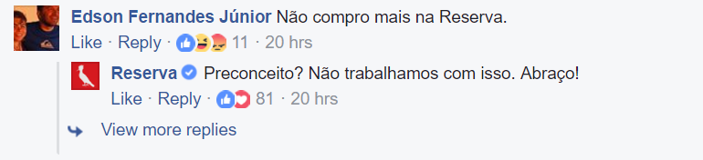 A preocupação da Reserva em responder aos comentários, principalmente os negativos, é um ponto importante no relacionamento entre marca e cliente nas redes sociais. Quando o consumidor vê seu comentário respondido há a sensação de que ele foi ouvido e que teve atenção por pelo menos alguns instantes. E é também nesse momento que a marca tem a oportunidade de continuar defendendo seu posicionamento, mostrando seu ponto de vista com argumentos pertinentes que ajudarão na propagação de sua campanha e na formação de uma imagem de marca engajada.
