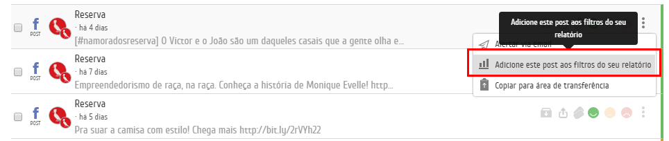 3 – Clique nos três pontinhos ao lado da barra de sentimentos e clique em “Adicione este post aos filtros do seu relatório”. Agora o ID dessa publicação faz parte de seus filtros em “Facebook Only” na parte de “Editar Relatório”.